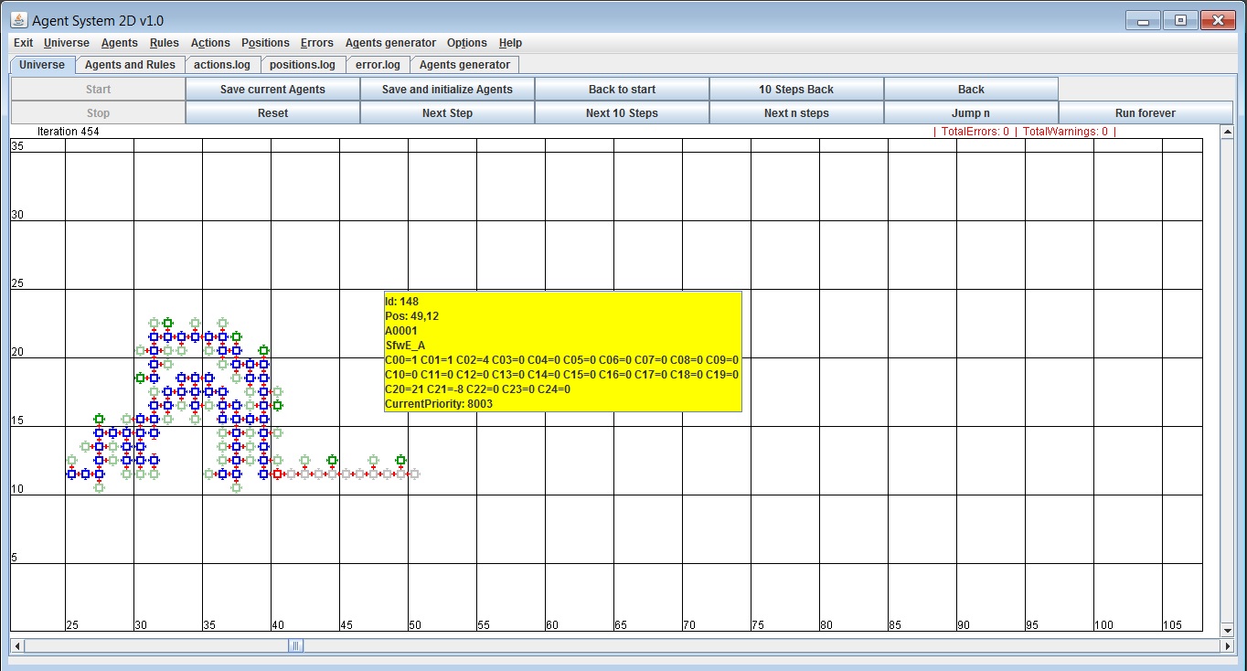 This AgentSystem assumes that each agent is capable to change its position in the lattice and that neighboring agents can attach to and detach from each other. In addition, it assumes that each module has some constant size memory and computation capability, and can send/receive constant size messages to/from its neighbors. The AgentSystem allows the user to define sets of agents and sets of rules, which are applied to all agents. It simulates the synchronized execution of the set of rules by all the modules, and can keep track of all actions made by the modules at each step, supporting consistency warnings and error checking. |